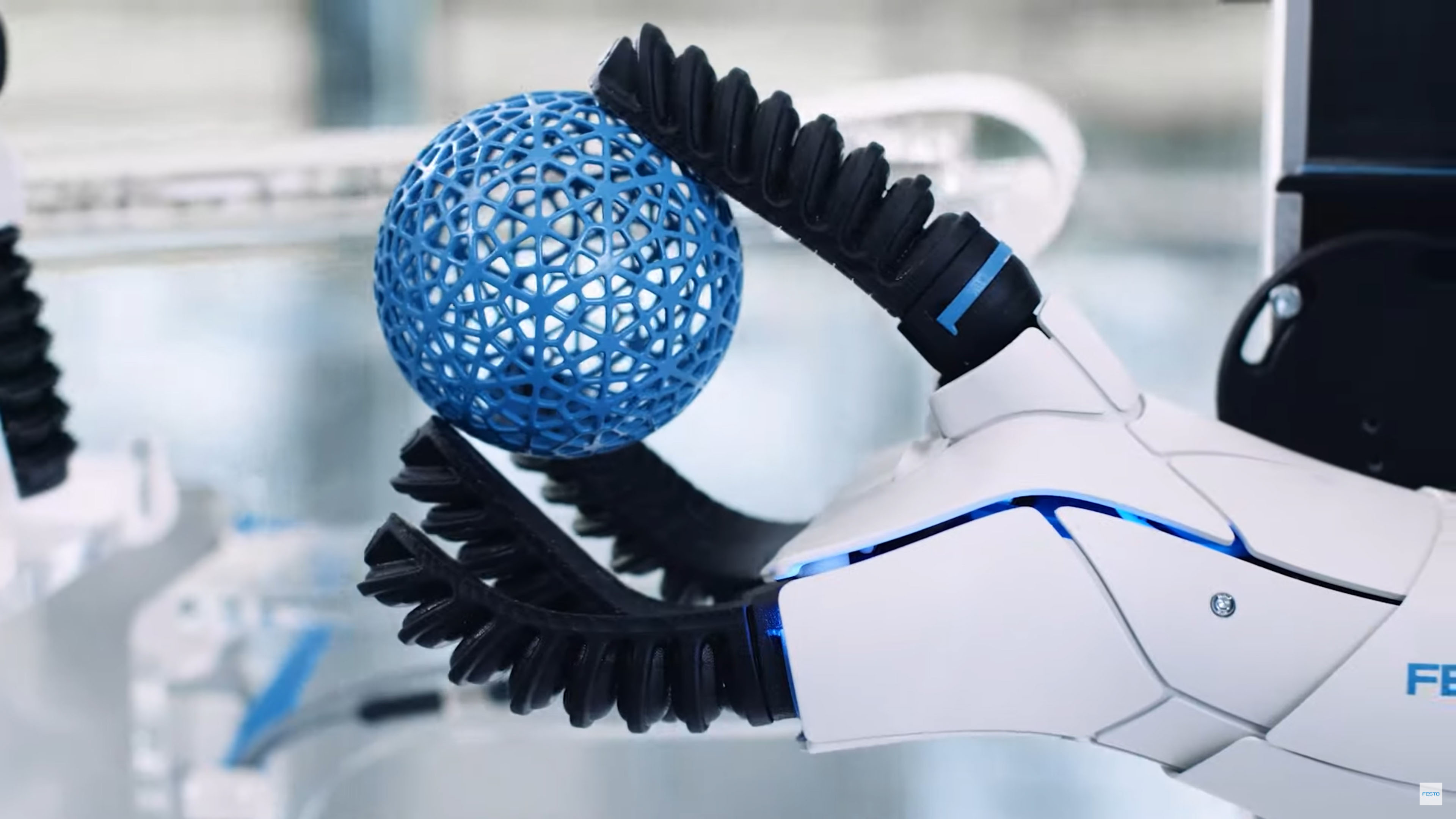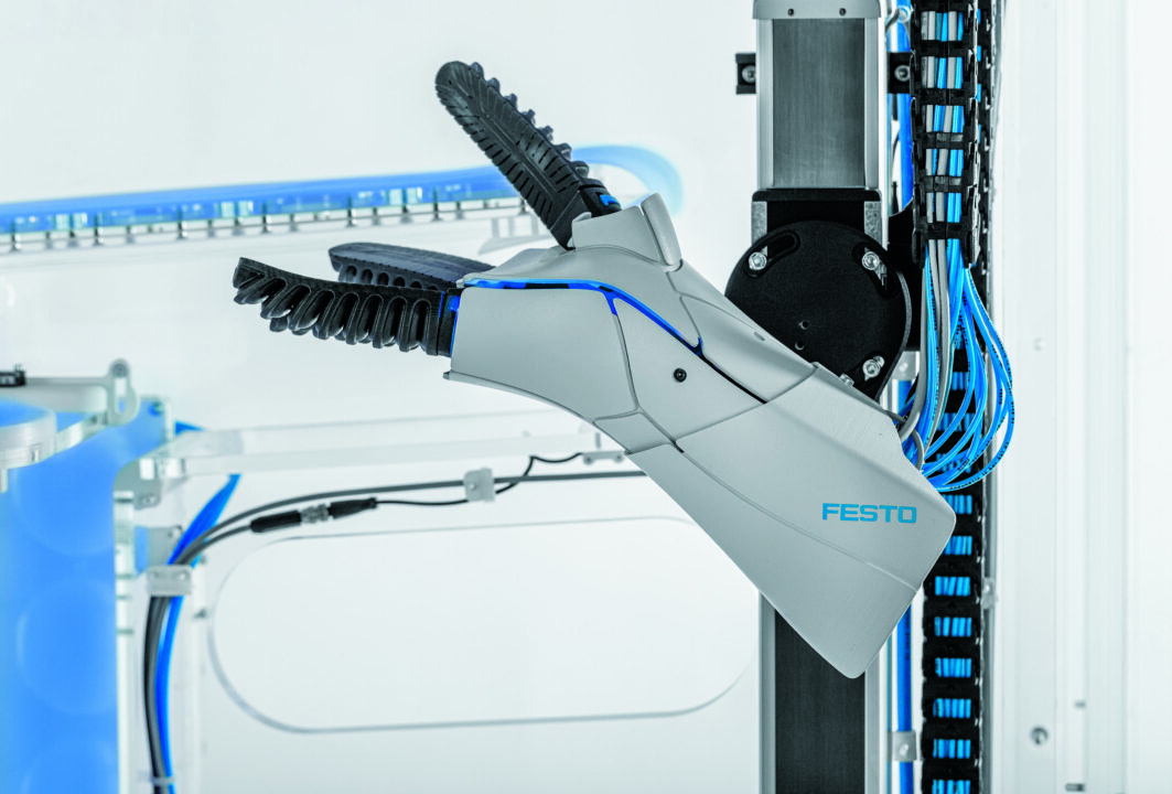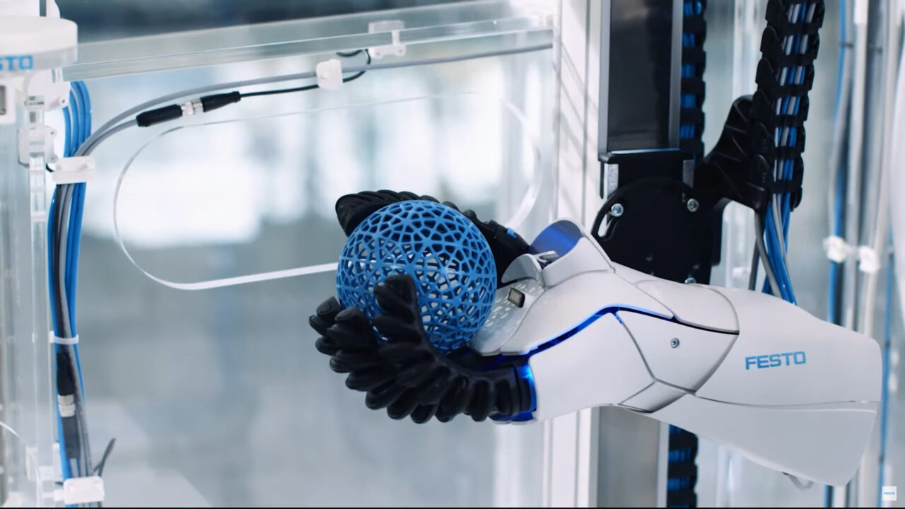 Soft robotic hand for collaborative handling tasks, capable of in hand manipulation as part of the „Festo Incredible Machine“ on the occasion of the company’s 100th anniversary.