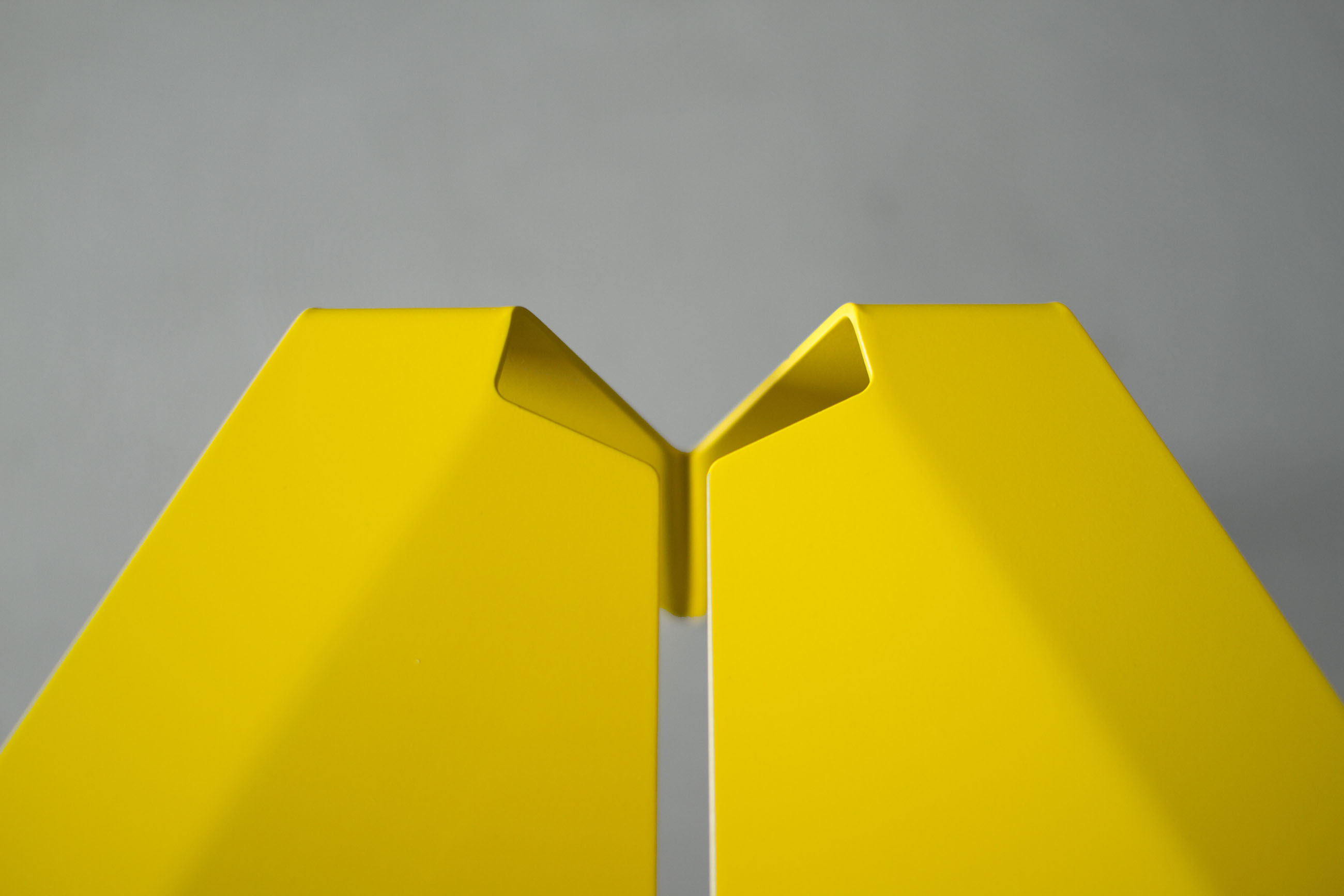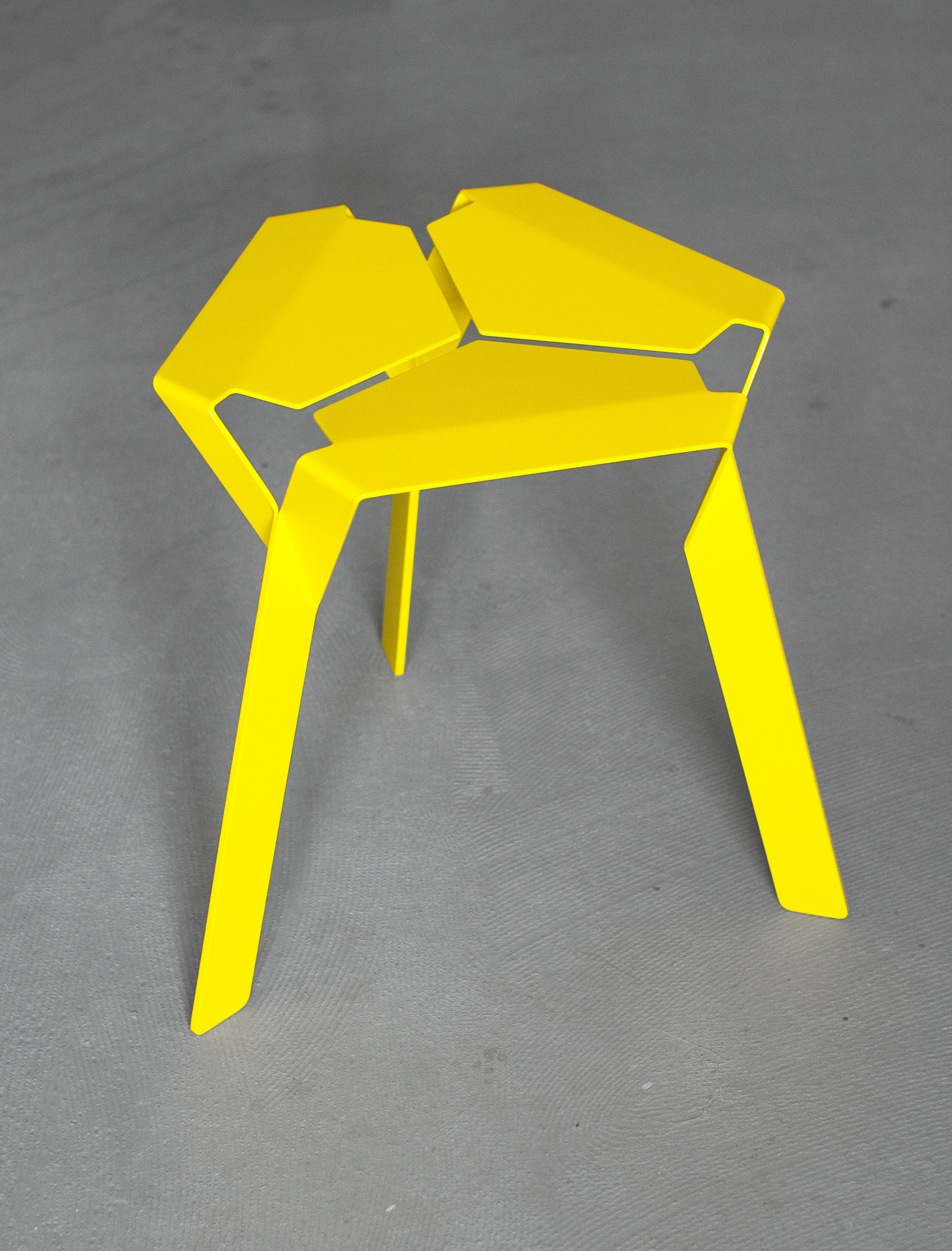In-house development of a stackable stool made from canted steal sheets. The stool is made from 3 identical stamped parts. Each part is canted twice on each side.